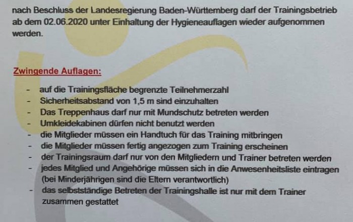 Wiedereinstieg in den Trainingsbetrieb Seit dem 02.06.2020 hat die Kampfsportschule Nürtingen unter Beachtung der Hygieneauflagen den Trainingsbetrieb wieder aufgenommen. Wir freuen uns auf das Erscheinen der Mitglieder im Training und möchten uns [...]